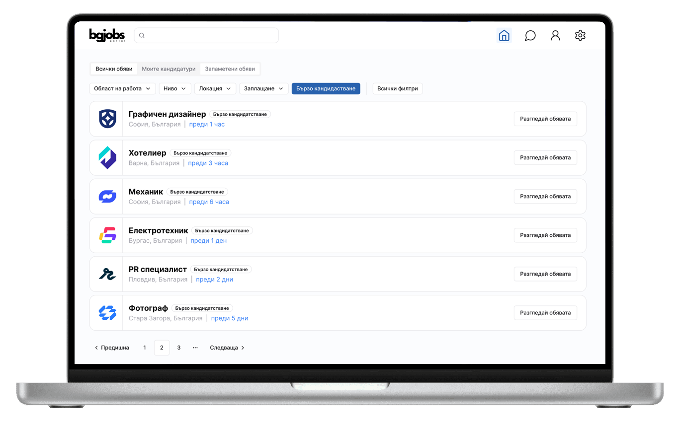Регистрираш фирмен профил, публикуваш обяви за минути и получаваш кандидатури в реално време. Можеш да комуникираш директно с кандидатите.